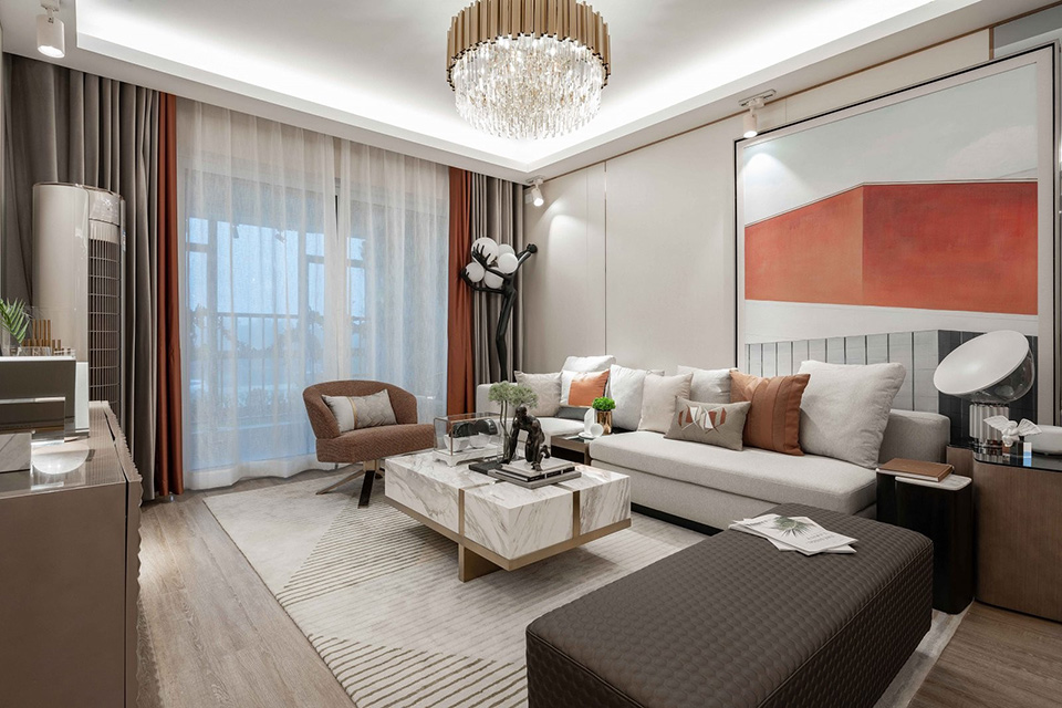 革新 生活從空間規劃到材質語言,逐步形成生活場景的界面,設計師從地理位置及文化記憶出發,從自然中提取配色和材質的靈感,以超越傳統樣板間的形態,精致打造一處時代革新的高品質高配套的棲居之所。金迪世紀駐深圳南山區華僑城版塊,以其得天獨厚的地段價值,背山面海,擁享“一城一灣,兩園三山”的豐富生態資源。出則都市繁華、入則小隱于市。▲客 廳一樓客廳為兩層挑空空間,尺度上的把控給予空間更多的舒適性,入戶映眼所及...